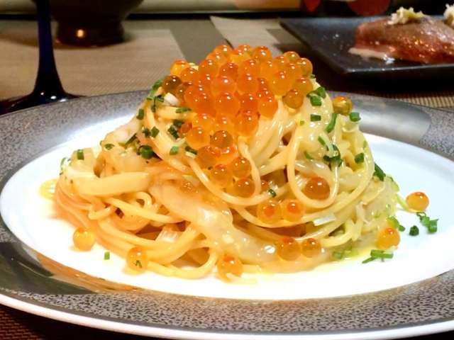 魚卵のパスタ 魚卵とゆうとカラスミをまず思い浮かべますけども
