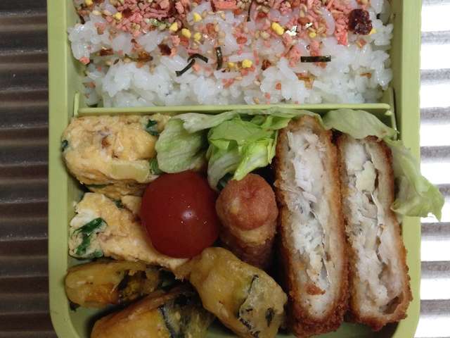 今日のお弁当 とうもろこしご飯と白身魚のフライのっけおべんで